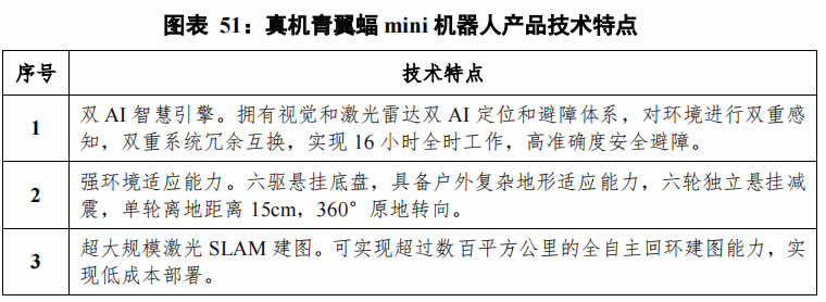 真機智能研製的真機青翼蝠 mini 機器人是一款自主移動測溫機器人,采用 L4 級自動駕駛技術,具備原地轉向、3D 環境感知、多單並發、語音交互、室內外兼 容、實時視頻監控等功能,具備 35°爬坡、夜間工作能力,IP54 防護等級可保障 其在室外人流混雜環境與雨雪天氣環境下持續安全運營。