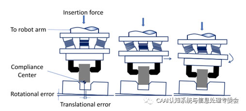 RCC是由Whitney和Nevins發明的,用於幫助機器人完成插入和裝配任務[41]。在他們的研究中,他們廣泛地討論了機器人的插入過程[42]。在插入過程中,銷釘會在軸向旋轉夾持器下傾斜,這稱為柔性中心。如圖3所示,RCC裝置實際上是一個有6個自由度的彈性機構,可以改變係統柔度中心的位置。在[43]中開發了一種具有計算機可調阻抗的主動柔性末端執行器。目前,將RCC與其他設備或控製方法相結合是非常有研究價值的課題。