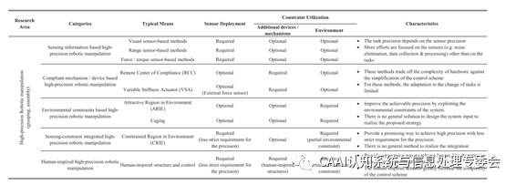在高精度的抓取和裝配工作中,僅僅依靠機械手本身的精度不能滿足任務要求。近期在IEEE TRANSACTIONS ON MECHATRONICS 上發表的一篇名為《A Survey of Methods and Strategies for High-Precision RoboticGrasping and Assembly Tasks—Some New Trends》的文章對近年來在機器人高精度抓取和裝配方麵的研究工作進行了分類、回顧和比較,並闡述了該領域的研究趨勢。