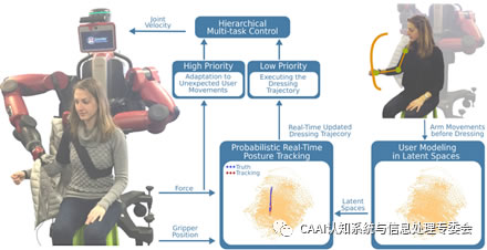 機器人可以為殘疾人或老年人的日常生活提供極大幫助,比如說機器人輔助穿衣。然而穿衣過程中,用戶上肢的突然動作可能導致穿衣任務的失敗,甚至為用戶帶來危險。使用視覺傳感器實時追蹤用戶上肢運動(user posture tracking)非常困難,因為衣服和機器人都對用戶造成了遮擋。例如,使用開源骨骼追蹤框架(OpenNI Skeleton Tracker [1])和深度學習方法OpenPose [2],均無法實施準確的追蹤用戶上肢運動。