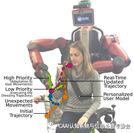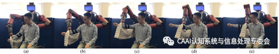 圖3展示了完整的穿衣過程。當用戶在穿衣過程抬起胳膊時,機器人也相應改變軌跡來減少受力情況,並實時運行至新的肘關節和肩關節位置。