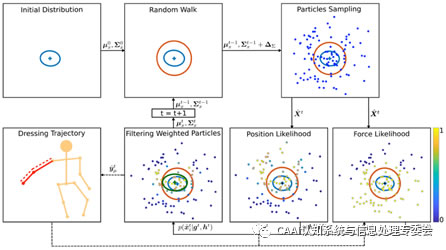 圖4 展示了在低維隱變量空間內粒子濾波的過程。我們根據力和位置的信息為每個粒子賦予新權重,從而循環更新。圖中顏色越淺代表權重越高。