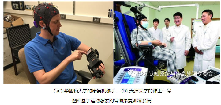 美國凱斯西儲大學Daly等通過運動想象檢測大腦皮層神經元的激活情況,表明BCI係統能有效地輔助患者誘發腦功能重塑並降低大腦皮層的異常激活。即主動的運動感知和被動外部設備相結合形成主被動康複訓練係統,將有利於受試者肢體的運動功能康複[4]。華盛頓大學Bundy等通過健側手部動作運動意圖輔助患者控製外骨骼機械手,實現了患者在日常生活中執行康複訓練[5],如圖3(a)所示。主被動康複訓練係統不僅能輔助正常受試者康複訓練,而且在患者的康複訓練中也取得了一定的進展。德國圖賓根大學VárkutiB等通過運動想象控製MIT-MANUS機器人輔助患者上肢執行康複訓練,結果表明上肢運動功能得到明顯改善[6]。如圖3(b)所示天津大學明東教授團隊通過患者肘關節屈-伸運動想象控製“神工一號”康複機器人輔助肘關節的康複運動,增強了康複訓練效果。西安交通大學徐光華教授團隊研究了目標誘導的運動想象刺激範式,證明了有目標導向的運動想象增強了對大腦皮層的激活並改善運動想象的能力[7]。韋恩州立大學Whyte等進一步提出了規範康複訓練體係可幫助患者主動參與康複訓練[8]。
