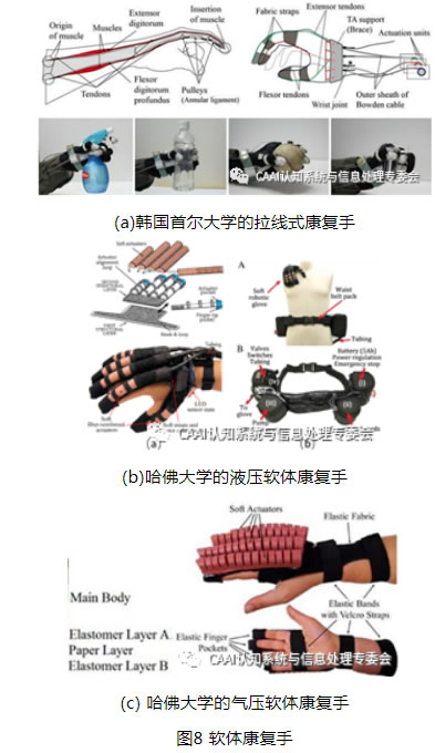 現有的軟體康複手大多采用拉線驅動、液壓驅動和氣壓驅動。韓國首爾大學的HyunKi In等人[10]設計了如圖8(a)所示的一種拉線驅動的軟體康複手Exo-Glove,在柔性織物手套的指套手背側和手掌側鋪設繞性金屬絲,驅動電機拉動繞性金屬絲,即可輔助手指的完成屈曲和伸展動作,指捏力量為20N,掌握力量為40N,驅動控製係統與手套本體分離使手套僅重196g,最大可以抓握直徑76mm的物體。哈佛大學的Panagiotis等人[11]設計了如圖8(b)所示的一款重量為285g的輔助患者抓握的液壓驅動的軟體康複手,並配備了一個重量為3.3kg的液壓驅動控製便攜式腰包。該液壓軟體康複手的軟體驅動器,由纖維增強材料製作的成型彈性腔與約束線、限製層組合製作,在增壓時可完成屈曲、扭轉、伸長等運動,可以輔助手指完成主動屈曲運動和被動伸展運動。哈佛大學的Stacey Lyne等人[12]利用3D打印模具進行軟材料澆鑄製作氣動軟體驅動器,從而製作成如圖8(c)所示的重量約為160g的 PneuNet 軟體康複手。該氣動軟體驅動器在靠近手背側嵌入彈性模量大的限製層,使驅動氣腔在增壓時向彈性模型大的一側彎曲,實現輔助手指主動驅動運動,氣壓為0.45Mpa時指尖壓力為1.2N。