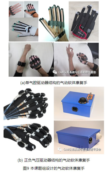 鑒於拉線式軟體康複手的驅動傳動係統較複雜、對手的壓迫感較強,液壓軟體康複手重量較大、有泄露汙染的風險,本課題組對重量更輕、成本更低、驅動控製較為簡單的氣動軟體康複手展開了研究。前期,本課題組利用限製層和纖維約束的單氣腔驅動器結構設計,並基於電容變化原理利用介電彈性材料製作柔性傳感器,設計了如圖9(a)所示的集成柔性傳感器的氣動軟體康複手,改變限製層方向,可以輔助人手分別實現主動伸展和主動屈曲運動,並檢測手指彎曲角度進行康複效果評估[13]。但是該氣動軟體康複手無法輔助人手實現拇指的內收/外展運動,也無法同時實現伸展/屈曲運動的雙向主動訓練。為此,本課題組又利用波紋管製作的正負氣壓驅動器製作了如圖9(b)所示的氣動軟體康複手。該氣動軟體康複手僅有149克,采用開放式手套,通過欠驅動可以輔助手指實現伸展/屈曲運動和拇指的內收/外展運動的主動訓練;配套的便攜式氣動箱體積小、重量輕,高級康複版氣動箱可調節六個輸出氣路的壓力和流量;實驗表明,伸展/屈曲驅動器在伸展時的最大作用力為4.6N,內收/外展驅動器在內收時最大作用力為8.1N。當前,該氣動軟體康複手的驅動器設計、控製設計仍在不斷地進行優化。