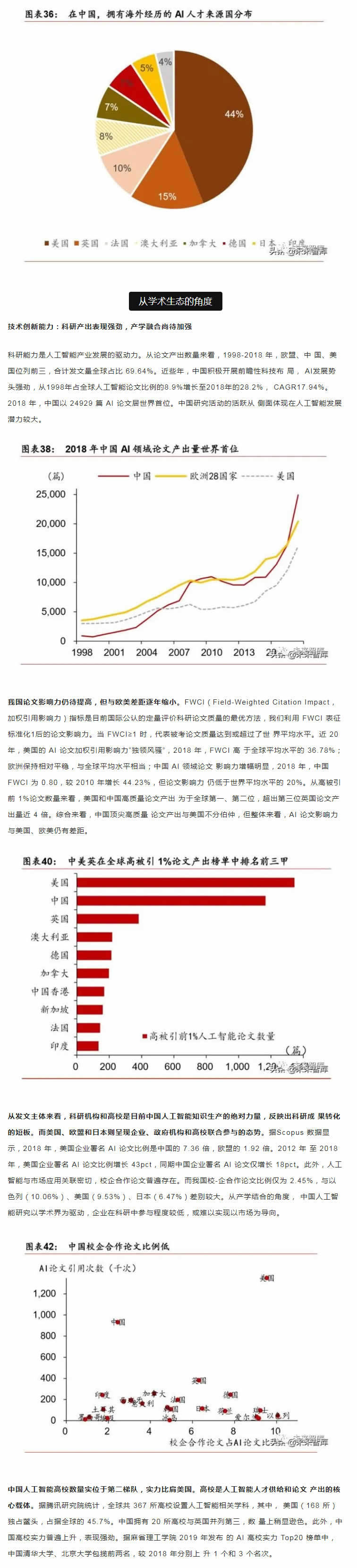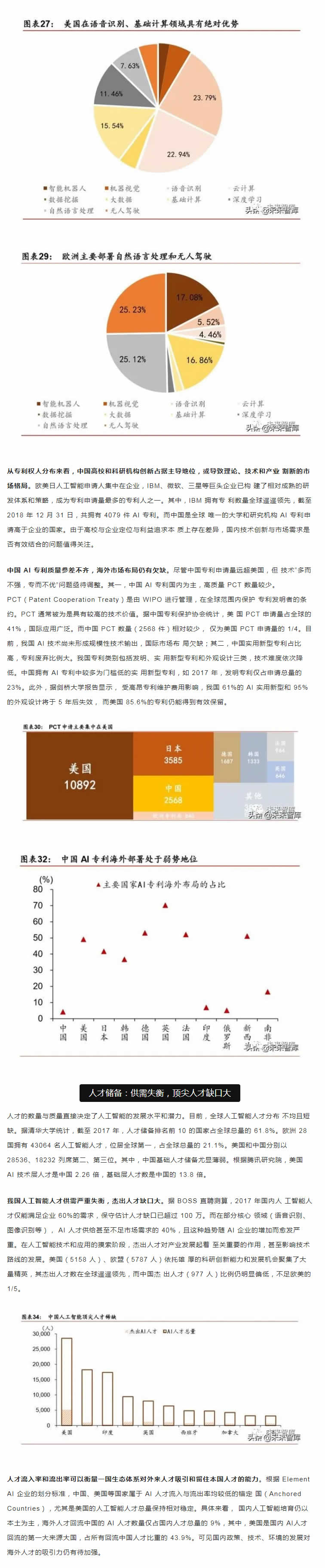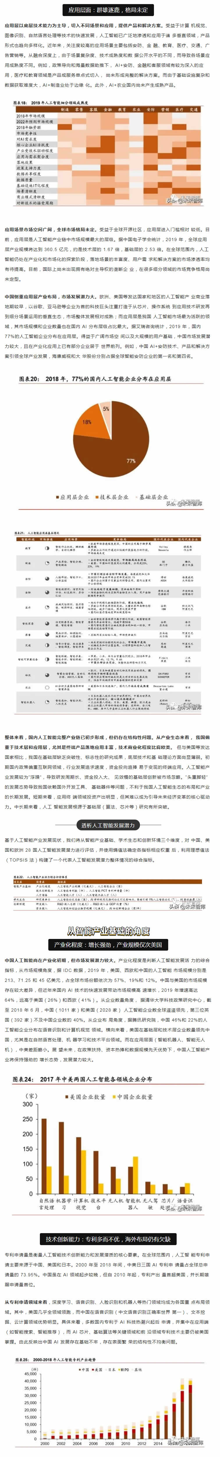 國內人工智能追趕速度迅猛,但基礎薄弱問題突出。在強有力的戰略引領和政策支持下、 依托龐大的數據體量、豐富的應用場景和高度的互聯網普及率,中國人工智能產業持續保 持蓬勃發展態勢,並躋身全球人工智能第一梯隊。技術上,我國人工智能論文和專利申請 量長期雄踞世界首位,在國際技術競賽中多次拔得頭籌;產業上,以阿裏巴巴、騰訊為代 表的科技巨頭全麵布局人工智能生態,以寒武紀、科大訊飛、商湯科技為代表的初創企業 深耕垂直領域,打造技術護城河。我國人工智能產業規模、資本投入、企業數量呈現爆發 式增長,智能技術與實體融合持續加強,落地場景不斷豐富。但我們也應當意識到,與美 國、歐洲相比,我國在產業鏈分布上更加集中於應用落地端口。長期市場化導向導致國內 行業發展出現結構性失衡,基礎理論缺乏、原創算法薄弱、高端芯片依賴進口等問題凸顯, 這也反映出中國人工智能發展不牢的風險點。因此,站在科技創新的“巨型風口”,我們 更需要審慎後續技術路線和產業發展路徑,加大科研攻關力度,補齊技術短板。