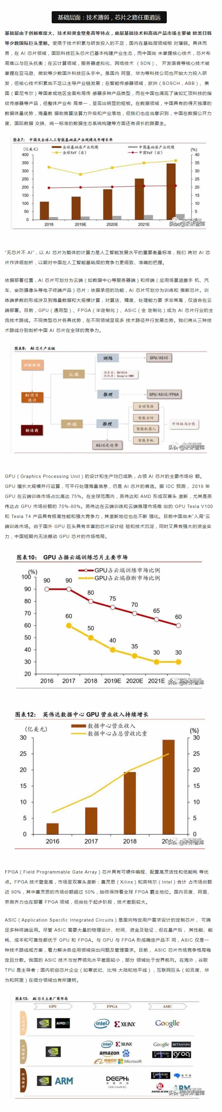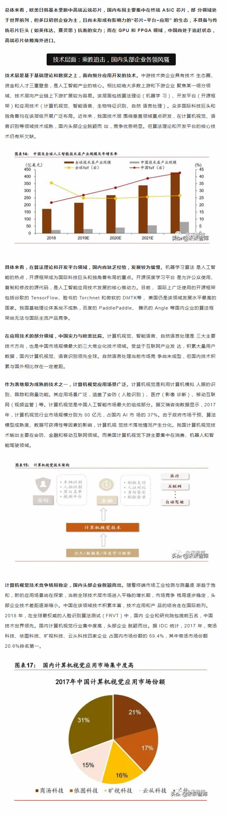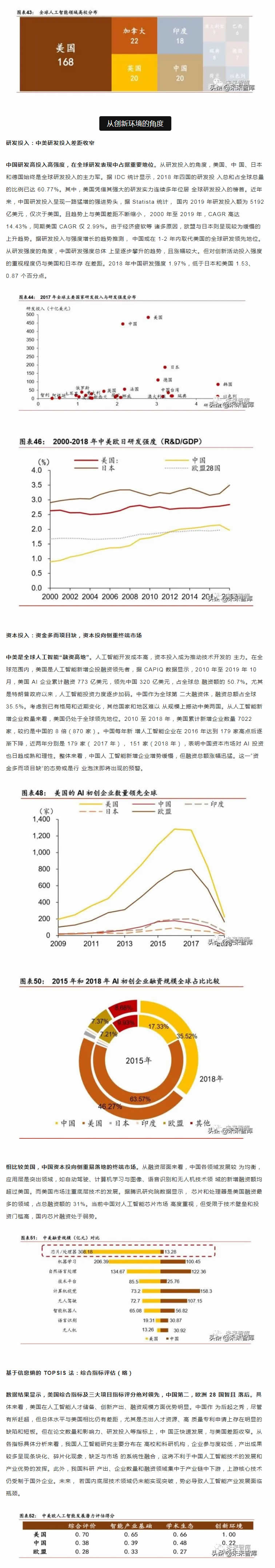 國內人工智能追趕速度迅猛,但基礎薄弱問題突出。在強有力的戰略引領和政策支持下、 依托龐大的數據體量、豐富的應用場景和高度的互聯網普及率,中國人工智能產業持續保 持蓬勃發展態勢,並躋身全球人工智能第一梯隊。技術上,我國人工智能論文和專利申請 量長期雄踞世界首位,在國際技術競賽中多次拔得頭籌;產業上,以阿裏巴巴、騰訊為代 表的科技巨頭全麵布局人工智能生態,以寒武紀、科大訊飛、商湯科技為代表的初創企業 深耕垂直領域,打造技術護城河。我國人工智能產業規模、資本投入、企業數量呈現爆發 式增長,智能技術與實體融合持續加強,落地場景不斷豐富。但我們也應當意識到,與美 國、歐洲相比,我國在產業鏈分布上更加集中於應用落地端口。長期市場化導向導致國內 行業發展出現結構性失衡,基礎理論缺乏、原創算法薄弱、高端芯片依賴進口等問題凸顯, 這也反映出中國人工智能發展不牢的風險點。因此,站在科技創新的“巨型風口”,我們 更需要審慎後續技術路線和產業發展路徑,加大科研攻關力度,補齊技術短板。