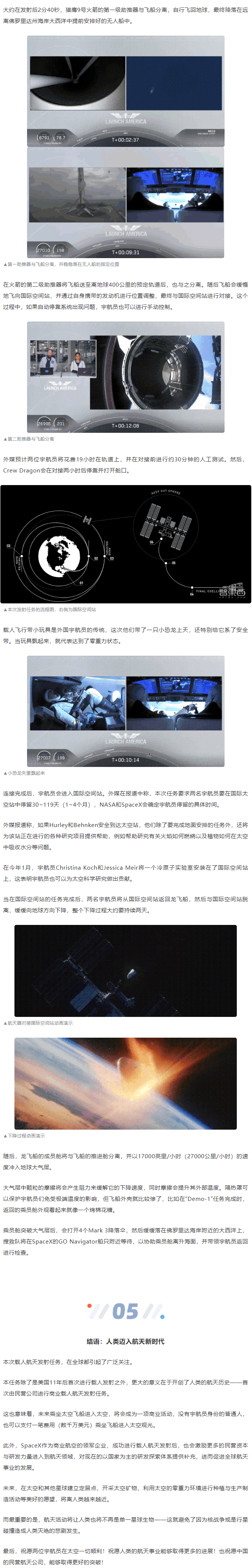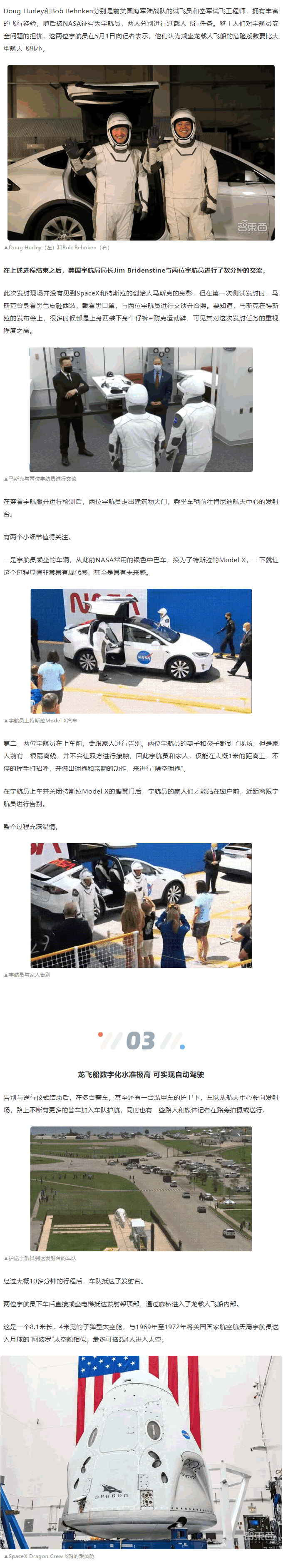對SpaceX來說,這是其成立近20年來首次執行航天產業中最艱巨、技術難度最高的載人航天任務,意味著其航天技術實現了新的突破,發展到了一個新的階段,受到了NASA乃至美國官方的完全認可。