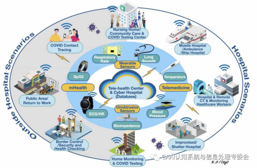 圖1 可穿戴設備在不引人注目的傳感器和遠程保健係統在流行病期間的應用場景(上麵的一些原始設計概念是從R.Pettigrew博士2012年在國家科學院舉行的IEEE生命科學大挑戰會議上的演示中借用的)[1]