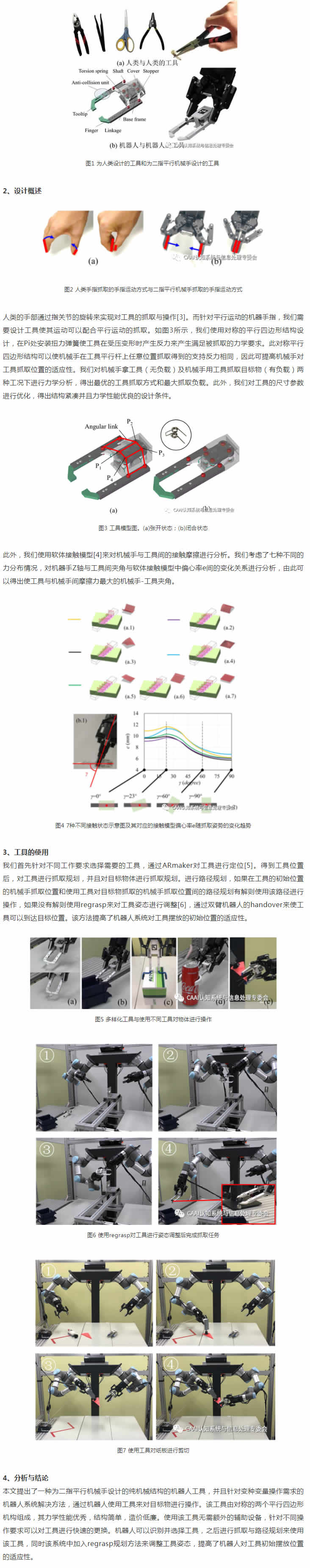 現代自動化生產中要求機器人係統具備一定柔性以適應變種變量的生產需求。例如在機器人分揀及組裝中,機器人需要快速處理各式不同的物體。使機器人係統可以穩定並且低成本的操控多種目標物體是實現新一代高效自動化生產的重要研究目標。目前機器人係統針對多種物體的操作,主要通過機械手/手指更換設備或多功能機械手來實現[1][2]。然而機械手/手指更換設備需要部署輔助控製設備和外部能源供給,這增加了係統的複雜度。同時,設備的控製與供能需要引入電纜或氣管,這會對機械臂的自由靈活運動產生幹擾。此外,多功能機械手僅可適用於一定範圍的操作任務。對此,我們提出了讓機器人使用不同工具來操作多樣化目標物的方法。這裏提到的工具並不是機器人學中對終端執行器的稱呼,而是同人類使用的鑷子,剪刀等工具一樣的可以被機械手直接控製的工具。此工具為複雜的變種變量的操作任務提供了一項有效的解決方案,它有如下特征:(1) 通過機械機構實現機械手到工具的動力傳遞,無需外部控製及供能;(2)結構緊湊,對機器人的避障路徑規劃影響極小;(3) 通過設計不同的工具先端實現可以對多種任務進行有效配適,在更換工具時僅需要對目標工具進行一次抓取;(4)純機械機構設計,成本低廉,可靠性強。