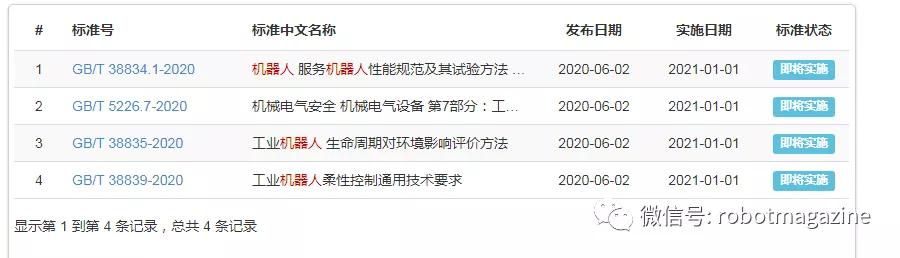 6月2日,國家市場監督管理總局和國家標準化管理委員會發布了4項與機器人相關的新增國家推薦標準,這4項標準均從2021年1月1日開始實施。