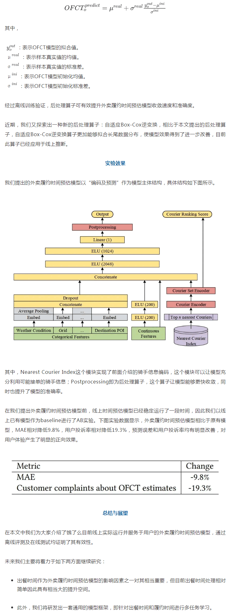 外賣履約時間預估(OFCT:Order Fulfillment Cycle Time)問題相比一般的時間預估問題而言更為複雜,其中存在餐廳與用戶的供需關係、餐廳出餐時間的未知性以及騎手行為的不確定性等問題。在論文中我們向學術界首次詳細介紹外賣履約時間預估這一問題,並給出了有效的解決方案,最後得到了審稿人的一致認可。