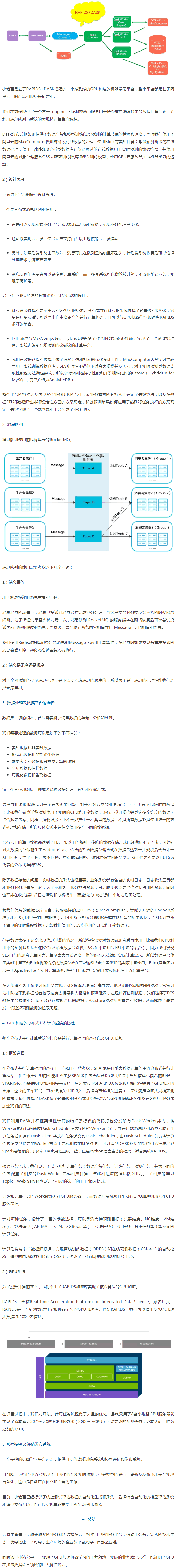 整個平台包含:Web服務、MQ消息隊列、Redis數據庫、SLS/MaxComputer/HybridDB數據獲取、OSS模型倉庫的上傳下載、GPU雲服務器、DASK分布式框架、RAPIDS加速庫。