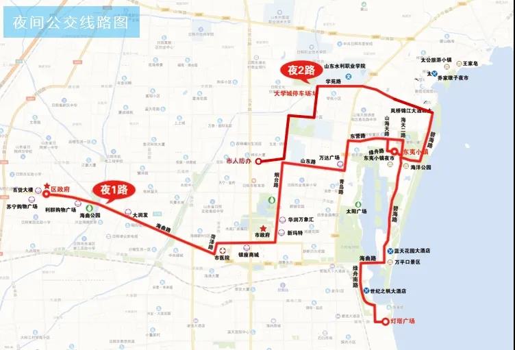 為助力夜間經濟發展,進一步滿足市民夜間出行需求,經前期調研,擬於6月20日起試運行由“東夷小鎮北”站經東營路、青島路、山東路、煙台路、泰安路、菏澤路、海曲路至“東港區政府”站的公交夜1路,由“市人防辦”站經山東路、煙台路、濱州路、學海路、學苑路、太公島二路、碧海路、海曲路、綠舟南路至“燈塔廣場”站的公交夜2路。具體情況如下: