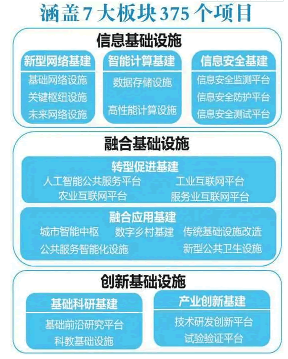 據《方案》,這批重大項目包括信息基礎設施、融合基礎設施、創新基礎設施3個方麵,細分為新型網絡、智能計算、信息安全、轉型促進、融合應用、基礎科研、產業創新7大板塊。