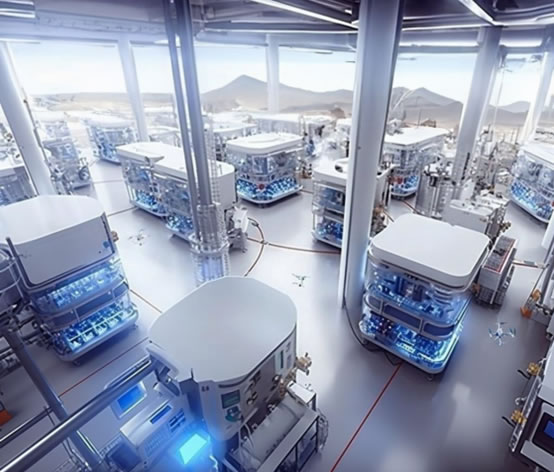 未來雲端實驗室可以被建設在太陽能/風能充足的荒漠中,科研人員可以從全世界任意一個地方控製雲端實驗室。園區內的兩大主體——數據流和物質流,將分別由互聯的AI網絡和機器人網絡負責運載。(本圖由MidJourney + Adobe Firefly生成)