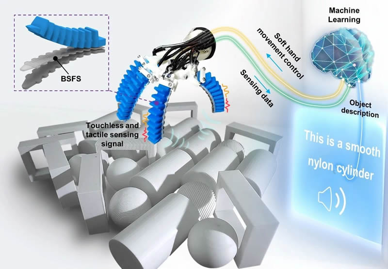在人類感知世界的過程中,皮膚的多模態感知為我們感受真實的物理世界提供了重要的工具。正如人們用手指觸摸未知的物品,當具有多模態感知能力的機器人手摩擦未知物品時,機器人便能感知到物品的粗糙度;當機器人手隔空拂過位置物品時,它甚至能像X射線和3D掃描儀那樣感知到物品的材質和形狀。因此,能夠感知環境的多模態傳感與擅長交互的軟體機器人的結合必然能擦出火花。