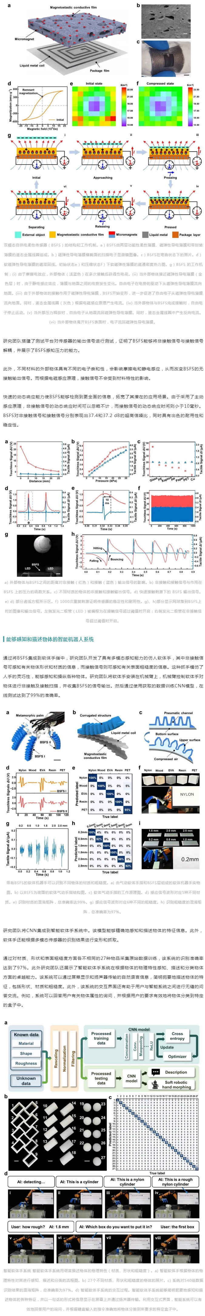 迄今為止,人們已經為開發多模態柔性傳感器做出了許多努力,然而在分離和解耦各種刺激類型的信號方麵仍存在挑戰。雖然研究人員一直致力於開發具有多模態柔性傳感器的智能機器人以感知各種環境信息,然而,目前的智能機器手缺乏全麵的多模態信息感知,尤其是對表麵物理特性的描述能力。這些局限性為軟體機器手進一步感知多模態環境信息和執行精細操作任務造成了阻礙。