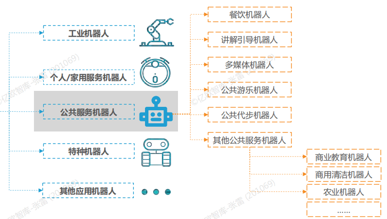 中國於2021年正式實施的新國標GB/T 39405-2020從五個維度對機器人進行分類。根據應用領域,機器人可分為五大類,其中公共服務機器人 是和工業機器人相對應的一大類別;根據服務對象的不同,公共服務機器人還可以分為餐飲、講解引導、多媒體、其他公共服務機器人等