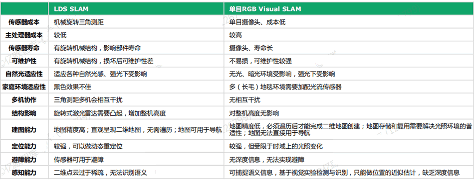 LDS SLAM 與 VSLAM 各有優劣,二者相容或成為行業主流發展方向之一。對比 LDS SLAM 技術與單目 VSLAM 技術,其中 LDS SLAM 技術可視範圍廣(VSLAM 隻有50-60度),環境適應性更強,地圖精度更高,同時能夠獲取深度信息,可以應用於避障;而VSLAM技術成本更低,攝像頭的壽命長、不易損、不增加機身高度,同時能夠捕捉語義信息,提升地圖分區精度。