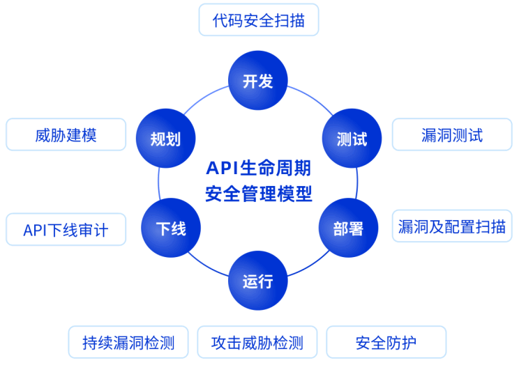 其次,API在整個業務生命周期當中變化非常快,API實現邏輯一旦發生變化,很容易引入新的風險。因此,從API全生命周期來考慮API安全,圍繞規劃、開發、測試、部署、運行到下線的每一個環節加強安全建設顯得尤為重要。