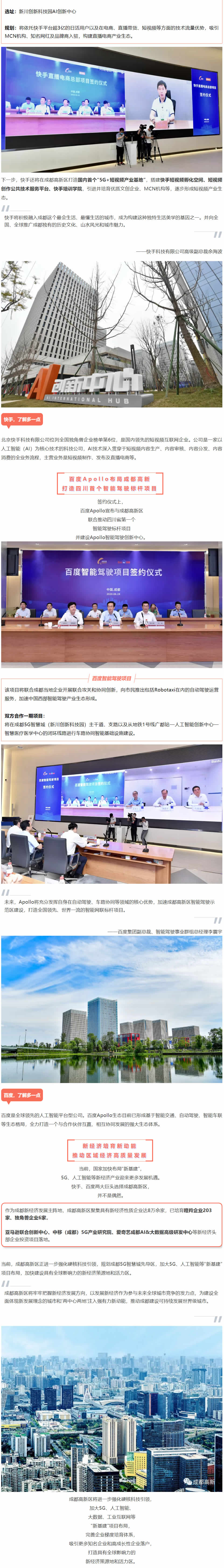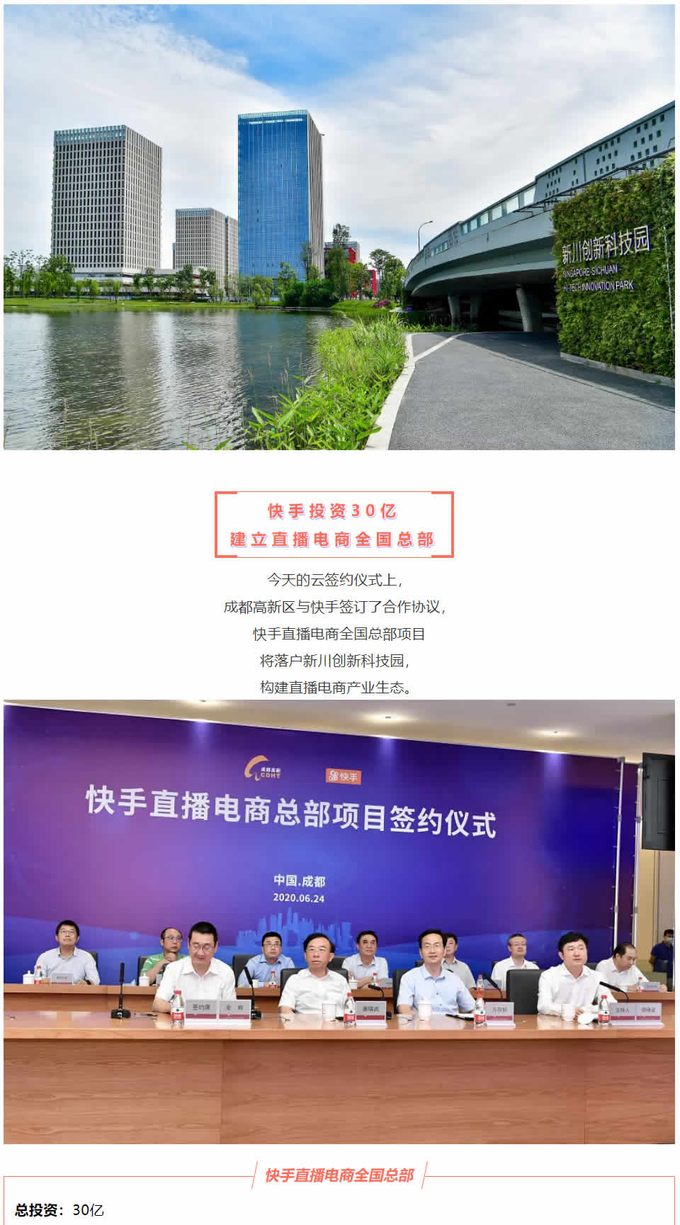 6月24日, 成都高新區分別與頭部短視頻平台快手、中國互聯網BAT三巨頭之一的百度簽約,宣布快手直播電商全國總部項目和百度智能駕駛項目落戶新川創新科技園。