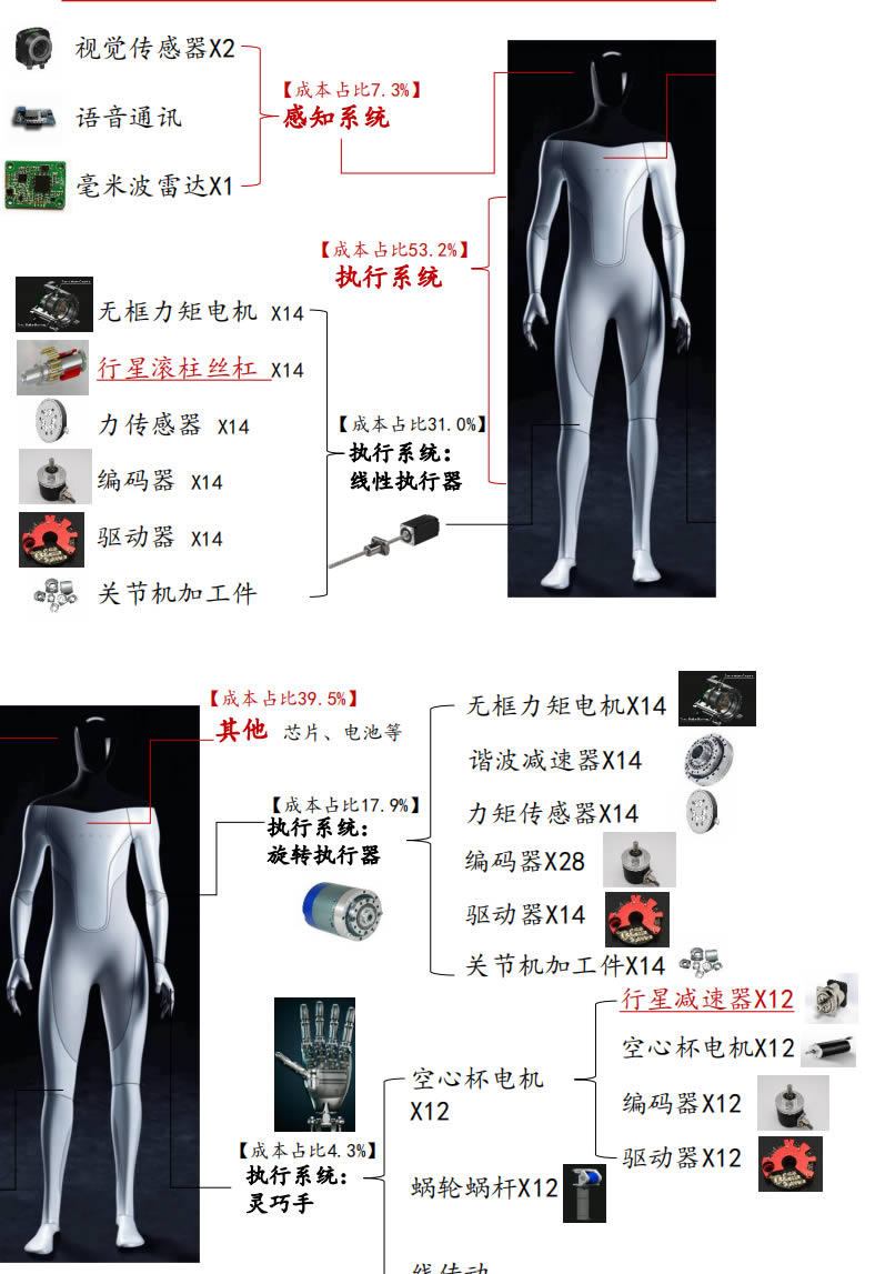執行係統BOM占比G,約53.2%(其中直線、旋轉、手部分別 占31.0%、17.9%、4.3%);感知係統占7.3%,其他芯片、電池等部件合計占比39.5%