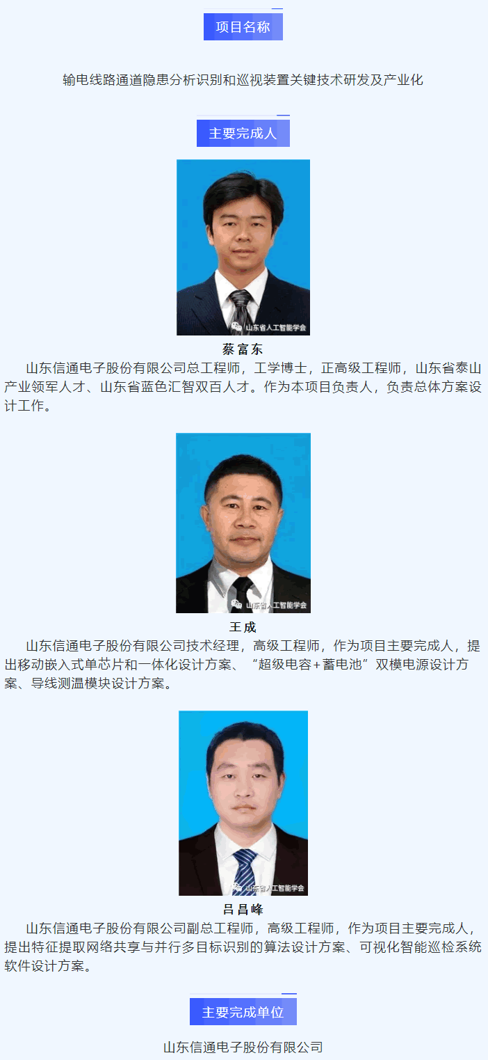 本項目屬於人工智能領域,在山東省重大科技專項、企業自主項目的支持下,經過5年持續努力,引入人工智能技術解決了以上行業難題,取得了係列成果:(1)首次提出了基於人工智能圖像識別技術的輸電線路隱患圖像分析方法,解決了人工識別工作量大、效率低的難題;(2)首次突破了在線監測裝置及係統規模化應用的主要技術障礙;(3)首次提出了評價處置到位程度的定量計算方法,開發了告警接收、處置安排及消警反饋的移動智能巡檢終端及其APP應用,融合人工智能、移動應用的可視化遠程巡檢係統,實現隱患實時監測、智能分析、預警推送和快速處置的全流程閉環。