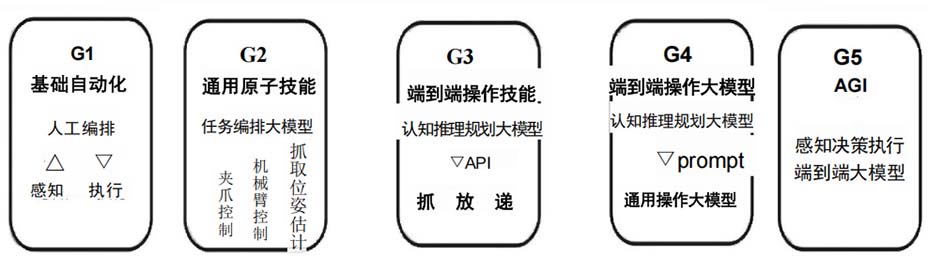 同時,智元還定義了G1 至 G5 的具身智能技術演進路線。G1 主要針對特定場景;G2 麵向更多場景任務, 具有一定的泛化能力;G3 從原先的算法驅動轉變為數據驅動;G4 引入了仿真數據和世界模型;G5 致力於 從感知到執行,具備G度的自主性和適應性。目前智元處於G2和G3階段,已在G2路線取得階段性突破, 實現了UniPose、UniGrasp、UniPlug 的通用原子模型,G3 路線上也形成了全流程具身數據方案AIDEA。