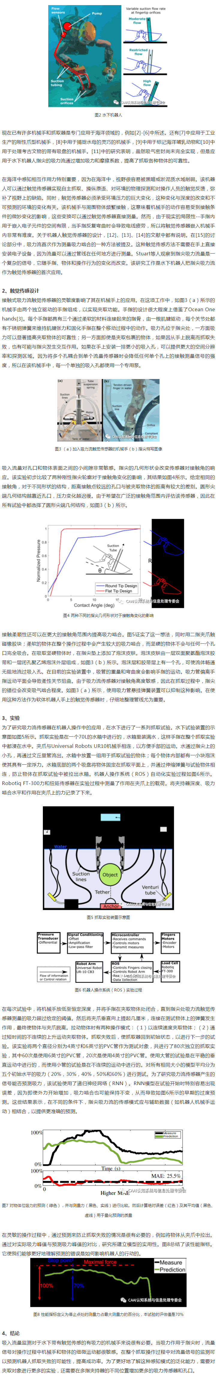 在海洋探索中,水下機器人能在深海或冰下進行海洋資源調查、估價、勘探、海底地形地貌攝影與繪圖、海底采樣、水文調查、海底石油管道與電纜的檢測與維修、海洋石油平台和海洋工作站的檢測維護等[1]。而在水下進行抓取和移動的雙手可以使水下機器人平台更好地應對具有挑戰性的場景。麵向水下機器人的靈巧操作,加州伯克利大學在ICRA2020發表了一篇“Tactile sensing based on fingertip suction flow for submergeddexterous manipulation”的論文。作者引入了一種新型的觸覺傳感方法,在柔順的手的指尖處使用溫和的吸力流,如圖2所示,可以方便地應用到水下機器人。該方案的一個最大好處是泵和傳感器可以安裝在靠近手臂的機器人底座上進行保護,並實現與機械手遠程連接。