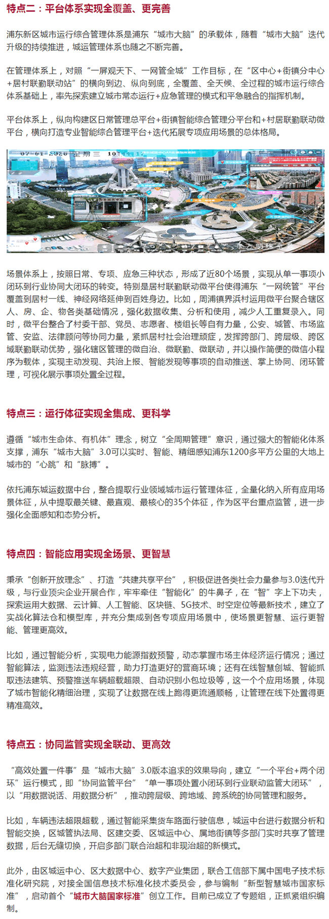 浦東“城市大腦”3.0版本,堅持從群眾需求和城市治理突出問題出發,緊扣市“一網通辦、一網統管”建設推進大會以及十一屆市委九次全會精神,始終把人民對美好生活的向往作為奮鬥目標,將“人民城市人民建,人民城市為人民”重要理念落實到建設運行的全過程和各領域,以智能化為突破口,全方位整合城市運行管理力量,全鏈條貫通城市運行管理體係,全覆蓋構建智能監管應用場景,全要素建立協同高效監管模式,努力實現城市治理亂點趨零、安全生產隱患趨零、綜合管理應急歸零。3.0版本在治理要素、平台體係、運行體征、智能應用、協同監管上體現了五大提升,打造更精細、更完善、更科學、更智慧、更高效的“一張網”。