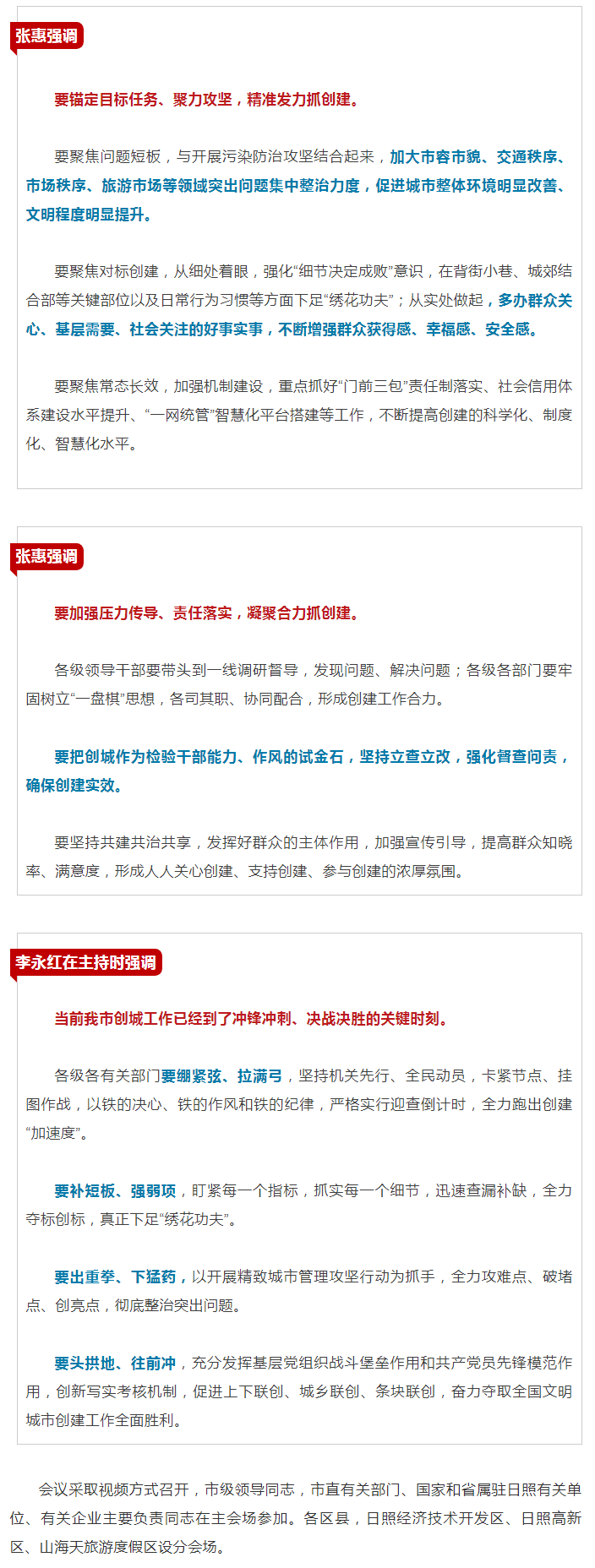 市委書記張惠講話,市委副書記、市長李永紅主持,市政協主席王斌,市人大常委會主任高傑,市委副書記李在武出席,市委常委、統戰部長楊留星通報創城模擬測評情況。東港區、嵐山區、日照經濟技術開發區、日照高新區、山海天旅遊度假區、市城市管理局、市市場監管局、市公安局交警支隊負責同誌作表態發言。