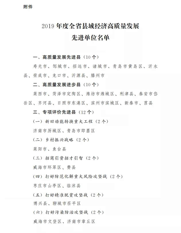 為表彰先進,進一步激發縣域經濟發展活力,增強縣域經濟發展動力,經研究決定,對2019年度10個“高質量發展先進縣”、10個“高質量發展進步縣”及12個“專項評價先進縣”進行通報表彰。