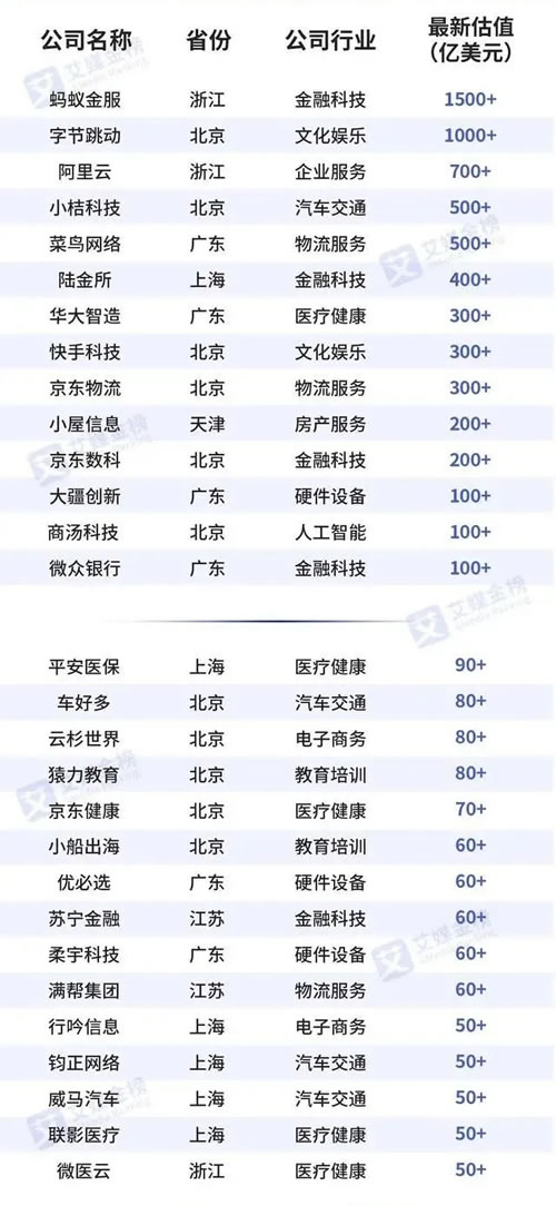 獨角獸名單:螞蟻集團,字節跳動,阿裏雲,滴滴出行,陸金所,京東數科,菜鳥網絡,快手,大疆,微眾銀行,比特大陸,貝殼集團
