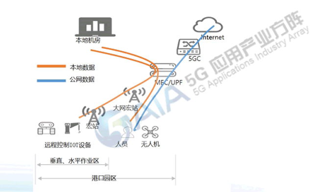案例整體采用SA組網,在港口區域部署大網宏站和專用宏站,提供港口生產業務的頻率專用服務,通過接入控製方案保障其它用戶無法接入專網小區,大大增強其業務性能(如時延、可靠性、速率)保障效果;目前已完成多個堆場連續覆蓋,滿足港口對速率、時延、可靠性、安全隔離等方麵需求。核心網部署專用5GC核心網切片,將UPF下沉至港口區,保障港口敏感 業務的數據安全隔離性,其餘核心網設備位於運營商機房,物理設備與其他項目共享,通過切片進行虛 擬隔離。港機PLC等港口設備通過CPE接入5G網絡,港區內的人員和無人機等則通過5G基站直接接入。