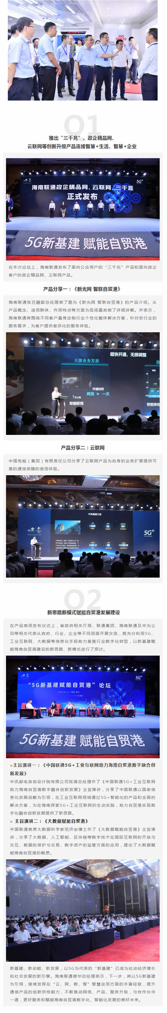 8月7日,海南聯通在海口亞特國際會議中心舉辦“5G新基建 賦能自貿港”論壇,並隆重發布了麵向公眾用戶的三千兆產品和麵向政企客戶市場的政企精品網、雲聯網產品。海南省工業和信息化廳、海南省通信管理局、海南省大數據管理局以及中國聯通集團公司、華為公司等業界專家和來自政府、企事業單位約200名人員出席了本次論壇活動。