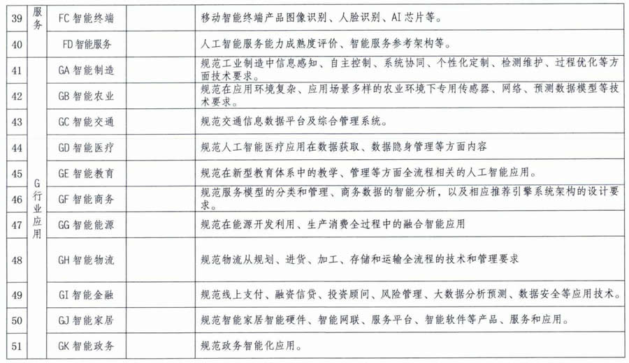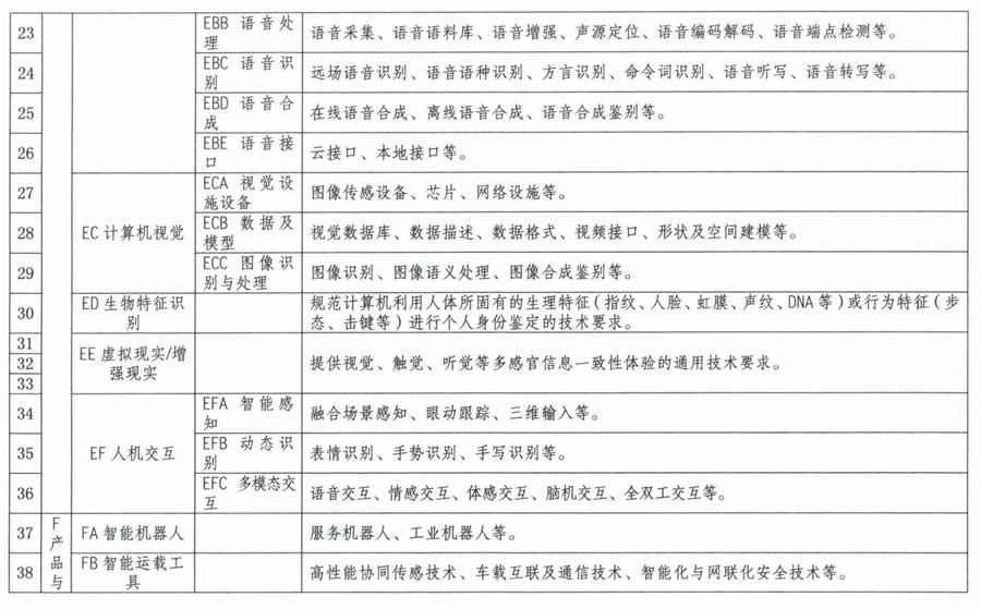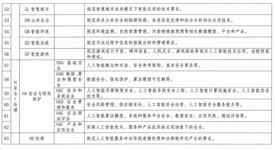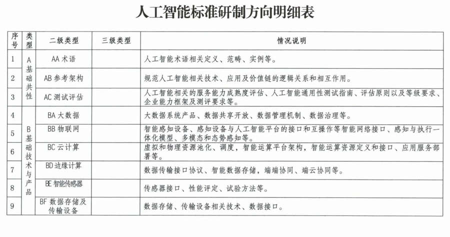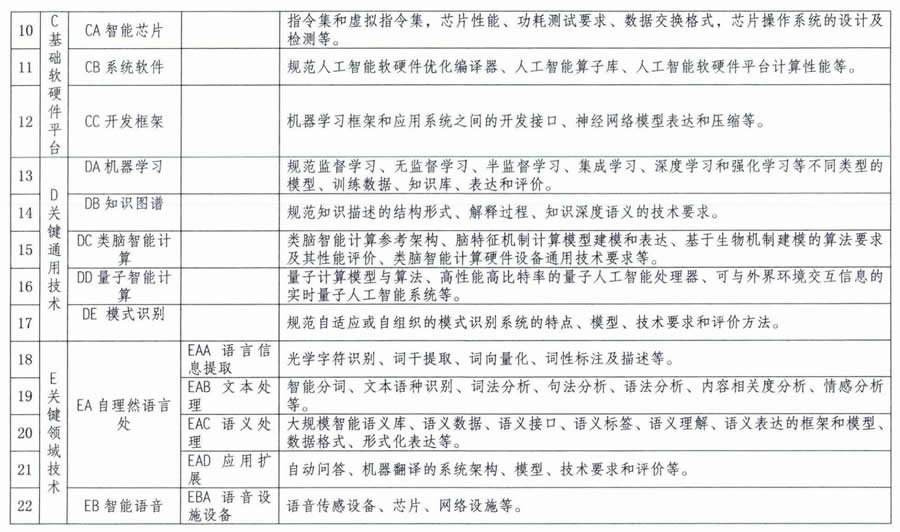 人工智能標準體係框架主要由基礎共性、支撐技術與產 品、基礎軟硬件平台、關鍵通用技術、關鍵領域技術、產品與 服務、行業應用、安全/倫理八個部分組成