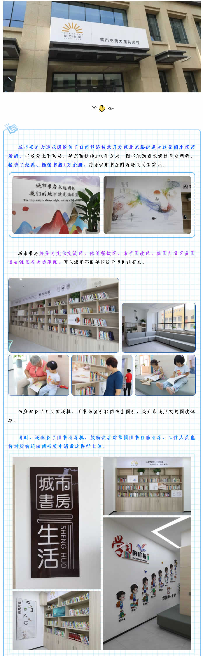 城市書房萬達廣場館位於日照萬達廣場二樓,總麵積280平方米,擁有圖書10000冊,設有閱覽桌椅45個,配有自助辦證服務終端、自助借還服務終端、圖書殺菌機、自沉式還書箱、查詢一體機等服務設備,方便讀者進行閱讀
