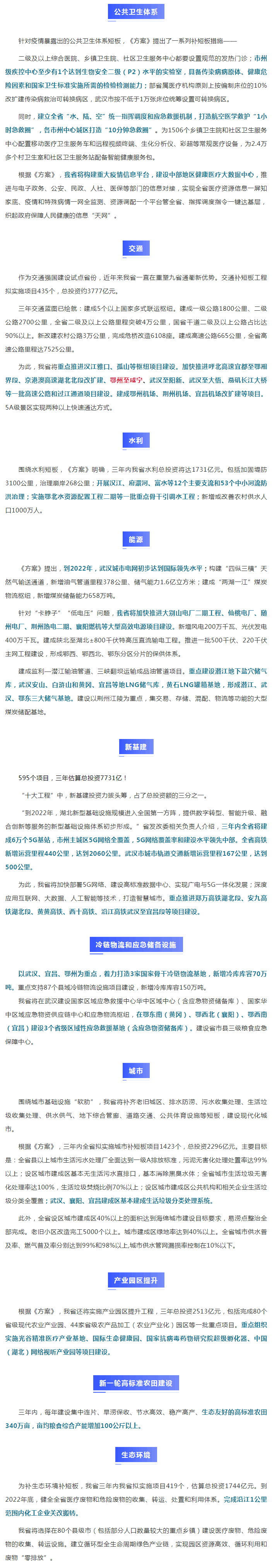 近日,湖北省印發《湖北省疫後重振補短板強功能“十大工程”三年行動方案(2020—2022年)》(以下簡稱《方案》),啟動疫後重振“十大工程”。 根據《方案》,我省將聚焦公共衛生體係、交通、水利、能源、新基建、冷鏈物流和應急儲備設施、城市、產業園區提升、新一輪高標準農田建設、生態環境等十大領域,用三年時間實施一批打基礎、補短板、強功能、利長遠、惠民生的重大項目。截至目前,“十大工程”滾動項目庫項目達4572個,估算總投資約2.3萬億元。