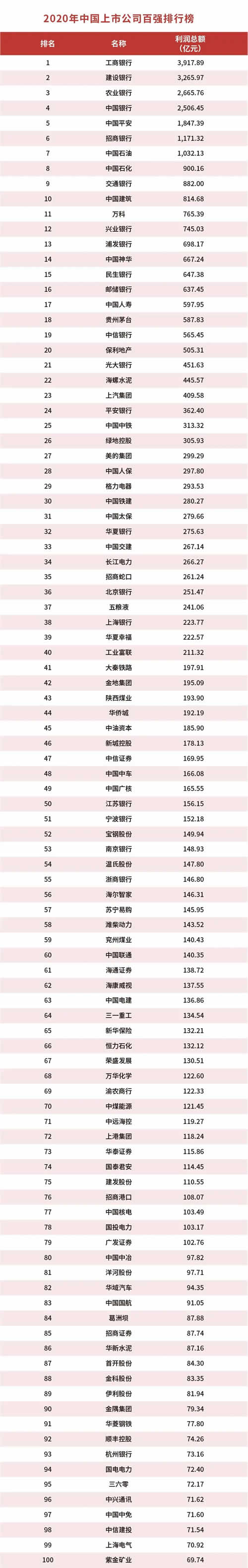 工商銀行以3,917.89億元的利潤總額連續十一年蟬聯榜首,建設銀行、農業銀行、中國銀行、中國平安、招商銀行、中國石油、中國石化、交通銀行和中國建築居第二至十位。與上年相比,前十格局保持基本穩定,僅招商銀行和中國石油位次互換。