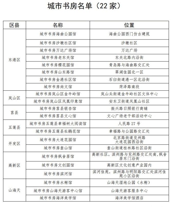 環衛所城市書房(環翠路南段,興業新營華府西門) 運總集團城市書房(黃海二路11號) 石臼街道城市書房(黃海一路與海濱五路交彙處) 開發區中心公園城市書房(天津路72號)