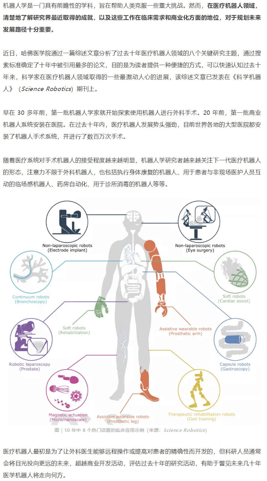 研究人員通過搜索 2010-2020 年期間《科學》雜誌上被引用最多的醫療機器人論文,確定了八個熱門研究主題,包括機器人腹腔鏡、用於微創手術的非腹腔鏡機器人、輔助穿戴式機器人、治療康複機器人、膠囊機器人、磁驅動、軟體機器人和連續體機器人等。