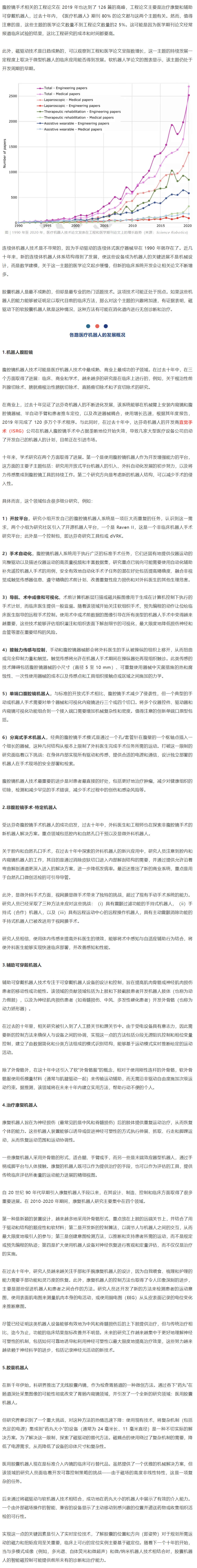數據顯示,工程和醫學期刊上關於醫療機器人的出版物數量呈指數級增長,從 1990 年的 6 篇增至 2020 年的 3500 多篇。醫學期刊論文主要是關於腹腔鏡機器人的出版物(占總數的 60% 至 70%),伴隨著達芬奇外科手術機器人係統的成功,2020 年發表的相關論文超過 1300 篇。