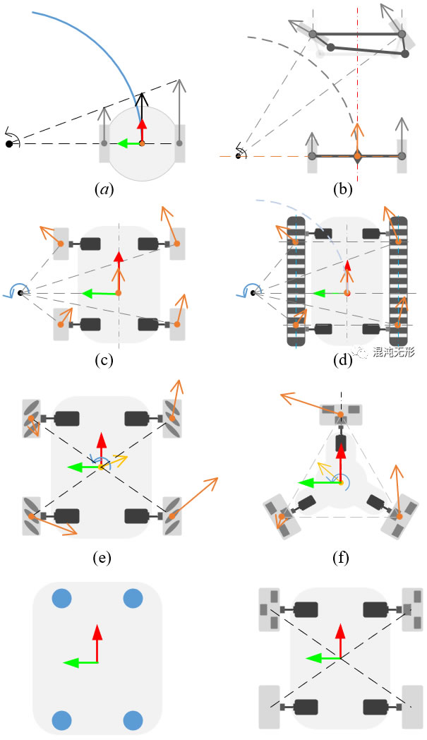 機器人開發平台常見8種構型.(a)兩輪差速驅動機器人,(b)car-like robot,(c)四輪驅動機器人,(d)履帶式機器人,(e)麥輪全向平台,(f)全向輪全向平台,(g)四驅四轉機器人,(h)四驅異構機器人.