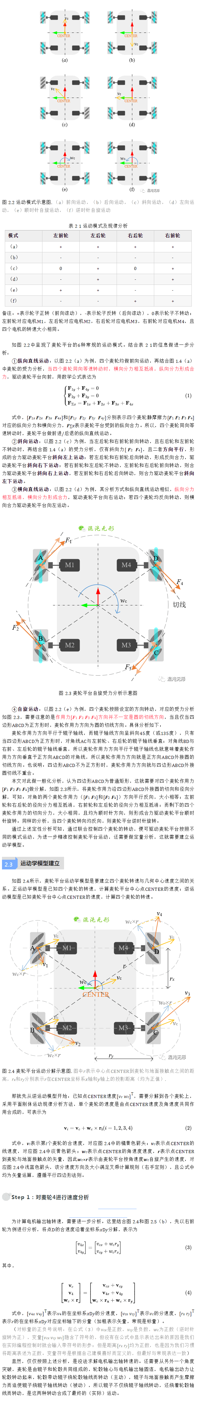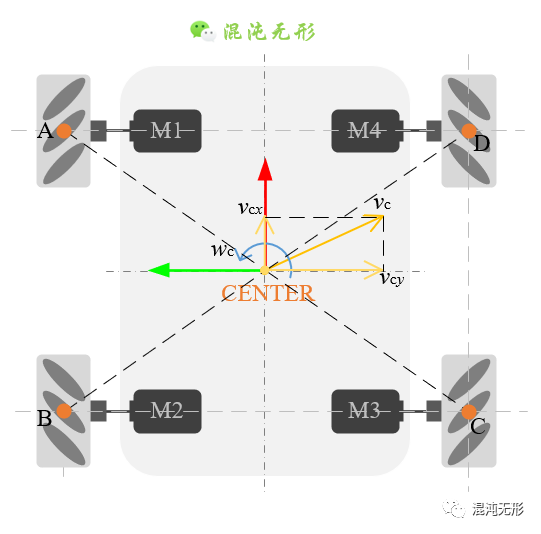 要滿足上述的分力能夠相互抵消的條件是麥輪(或電機)轉速大小相同,因為每個麥輪受到的地麵支持力相同(基於假設①②),4個電機又勻速等速轉動,意味著電機輸出扭矩與地麵作用於麥輪的摩擦力是平衡的,4個麥輪摩擦力在輪轂軸向和徑向上分解的大小是相同的,而速度分解與力分解類似,所以4個麥輪沿輪轂軸向和徑向的分速度大小是相同的。