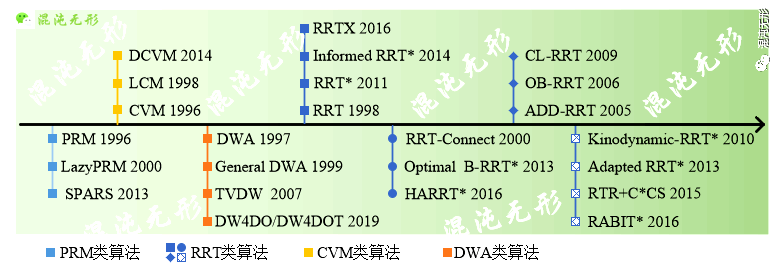 基於狀態空間采樣的算法能夠在大麵積、高緯度的空間中快速生成路徑,包括RRT和PRM類算法等,具有概率完備性,其主要步驟包括隨機采樣、度量連接、碰撞檢測和路徑查詢。