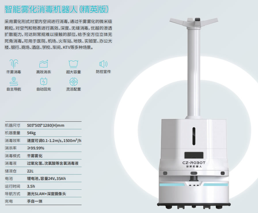 創澤精英版霧化消毒機器人以輪式機器人底盤為載體,采用霧化形式對室內空間進行消毒,通過幹霧霧化的微米級 顆粒,對空氣和物表進行高效、深度、無縫消毒,優越的滲透 擴散能力,可達到常規難以接觸的部位,給予全方位立體無 死角消毒。可用於醫院、機場、火車站、地鐵、實驗室、辦公大樓、銀行、商場、酒店、學校、車間、KTV等多種場景
