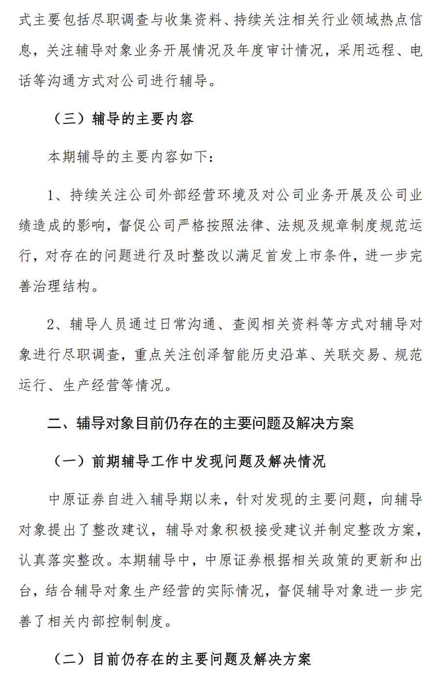 2、輔導人員通過日常溝通、查閱相關資料等方式對輔導對象進行盡職調查,重點關注創澤智能曆史沿革、關聯交易、規範運行、生產經營等情況。