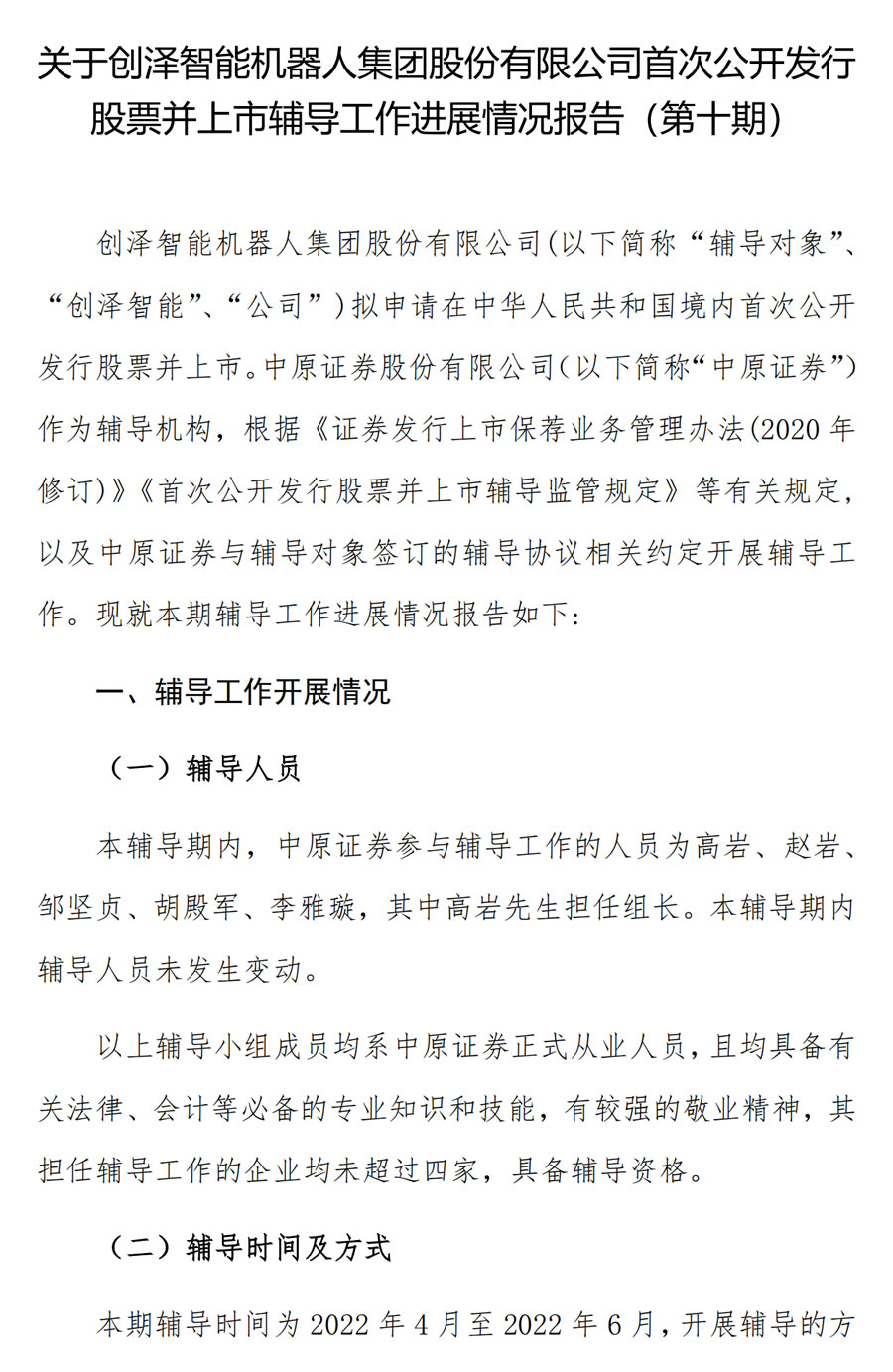本期輔導時間為 2022 年 4 月至 2022 年 6 月,開展輔導的方式主要包括盡職調查與收集資料、持續關注相關行業領域熱點信息,關注輔導對象業務開展情況及年度審計情況,采用遠程、電話等溝通方式對公司進行輔導。