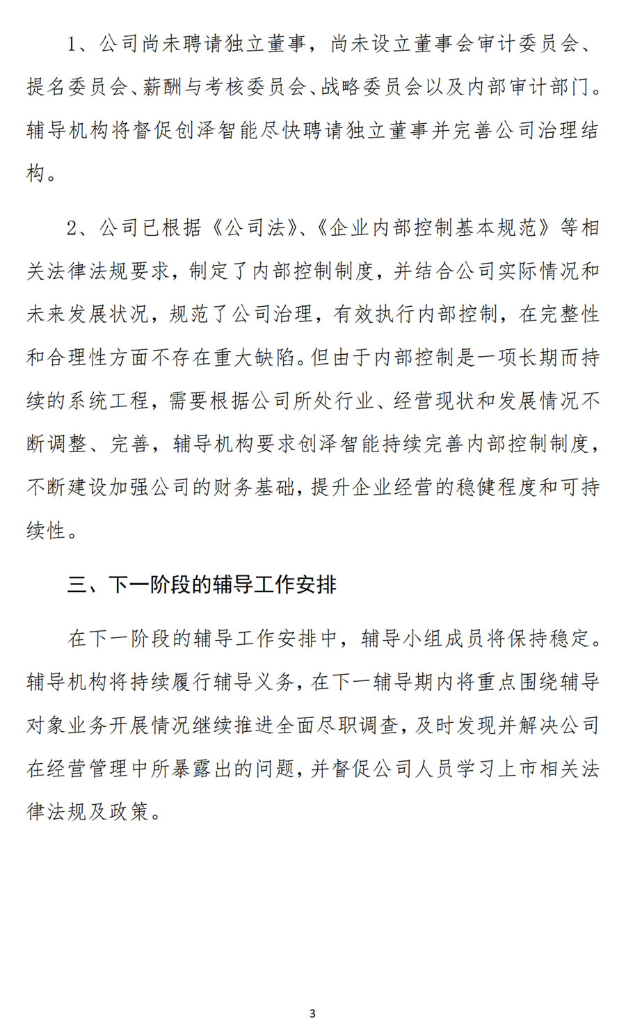 1、公司尚未聘請獨立董事,尚未設立董事會審計委員會、提名委員會、薪酬與考核委員會、戰略委員會以及內部審計部門。輔導機構將督促創澤智能盡快聘請獨立董事並完善公司治理結構。